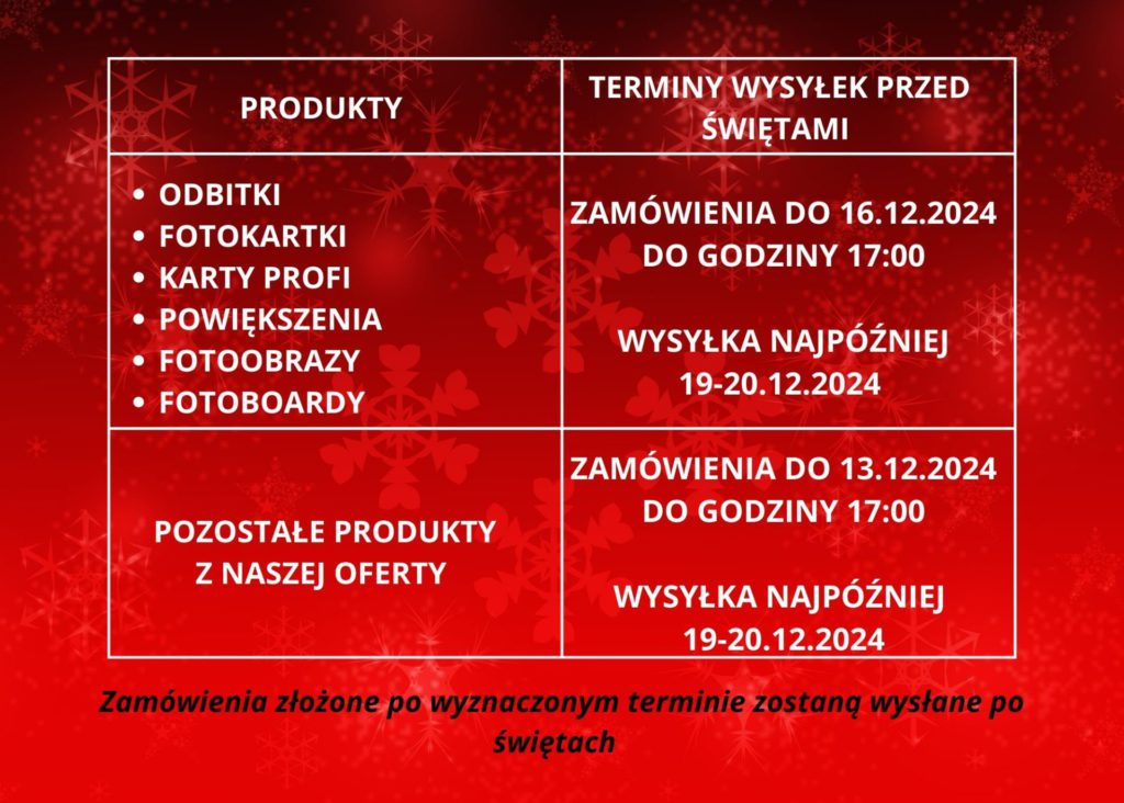 Okres przed Świętami Bożego Narodzenia to czas pełen intensywnej pracy i przygotowań, zarówno dla Was, fotografów i filmowców, jak i dla nas – zespołu zajmującego się produkcją i realizacją fotoproduktów. Robimy wszystko, co w naszej mocy, aby zapewnić terminową realizację Waszych zamówień i dostarczenie ich do klientów przed świętami, minimalizując przy tym stres i niepewność związane z dostawami.